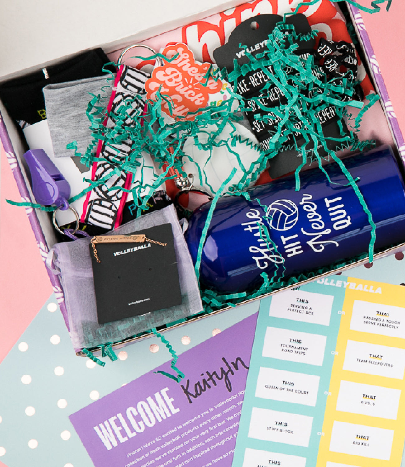 Volleyballa Box is a monthly volleyball t-shirt club delivered right to your door! Each box comes with 1 high-quality t-shirt, 1 limited edition enamel pin, 2 die-cut vinyl stickers, and a motivational insert — all curated to a fun volleyball theme.