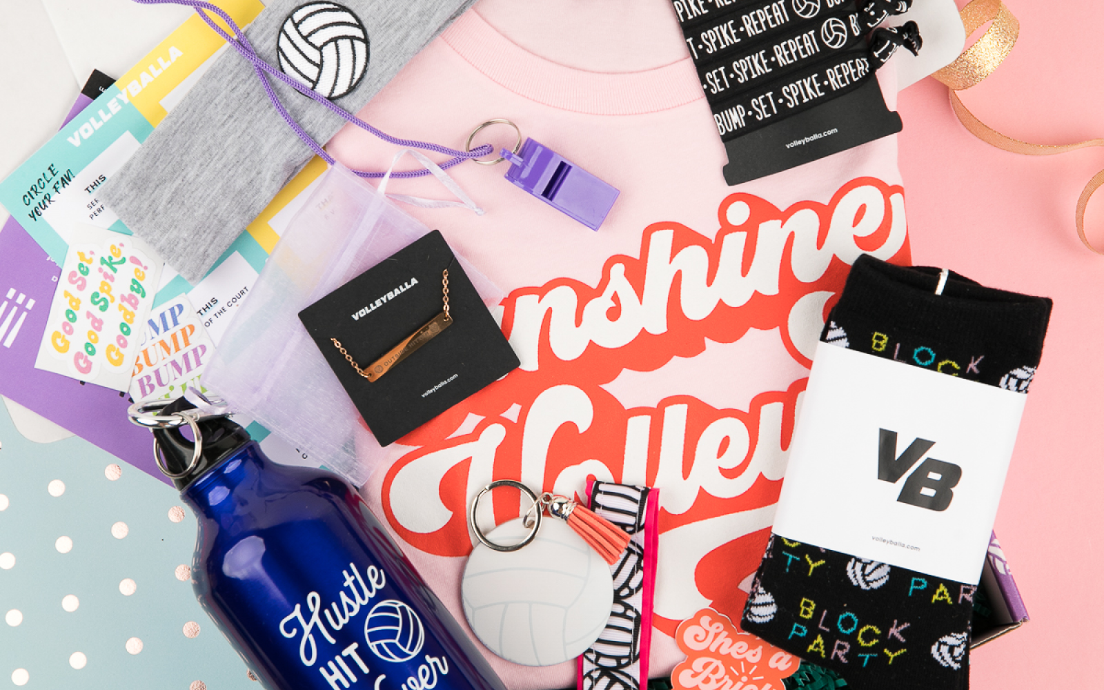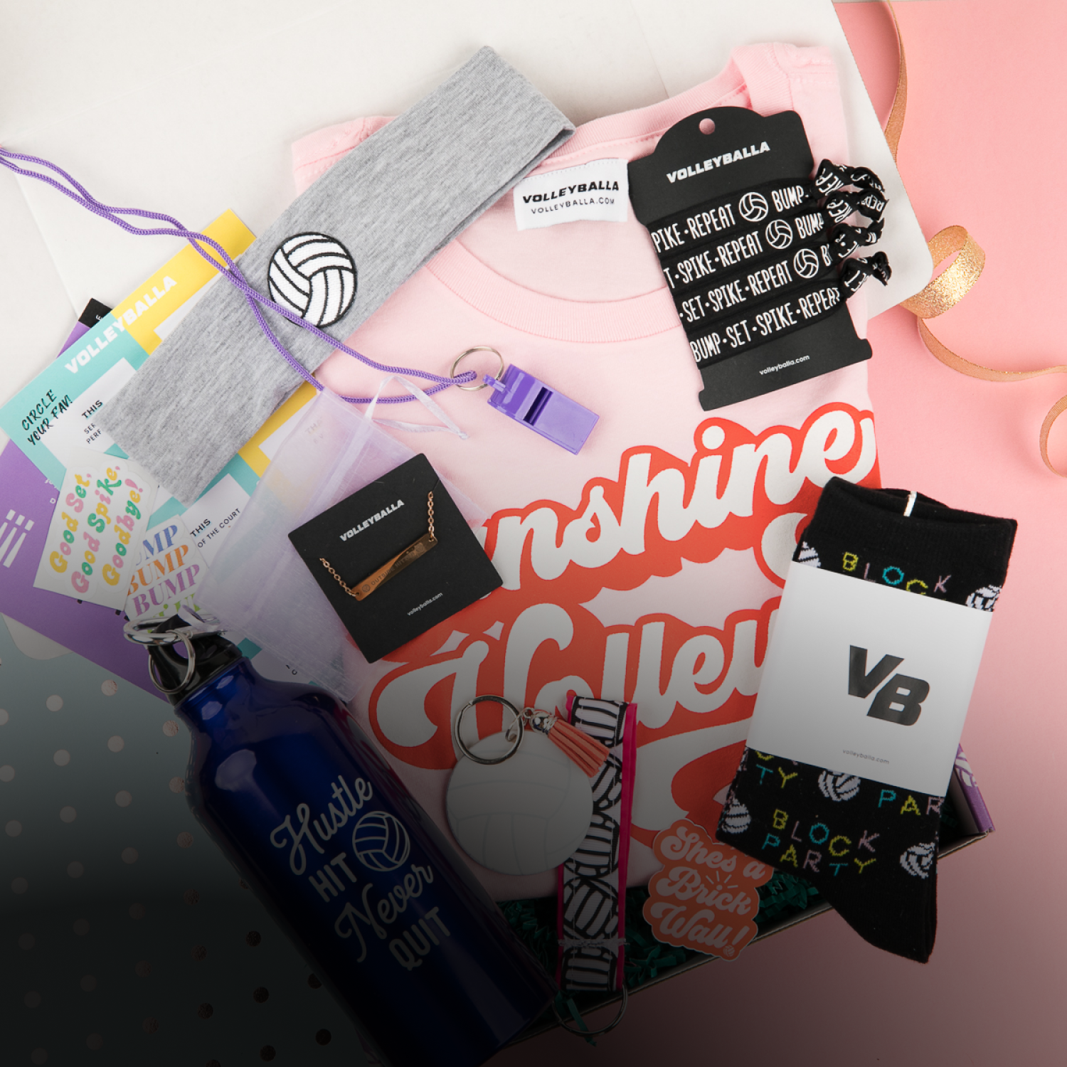 Volleyballa Box is a monthly volleyball t-shirt club delivered right to your door! Each box comes with 1 high-quality t-shirt, 1 limited edition enamel pin, 2 die-cut vinyl stickers, and a motivational insert — all curated to a fun volleyball theme.