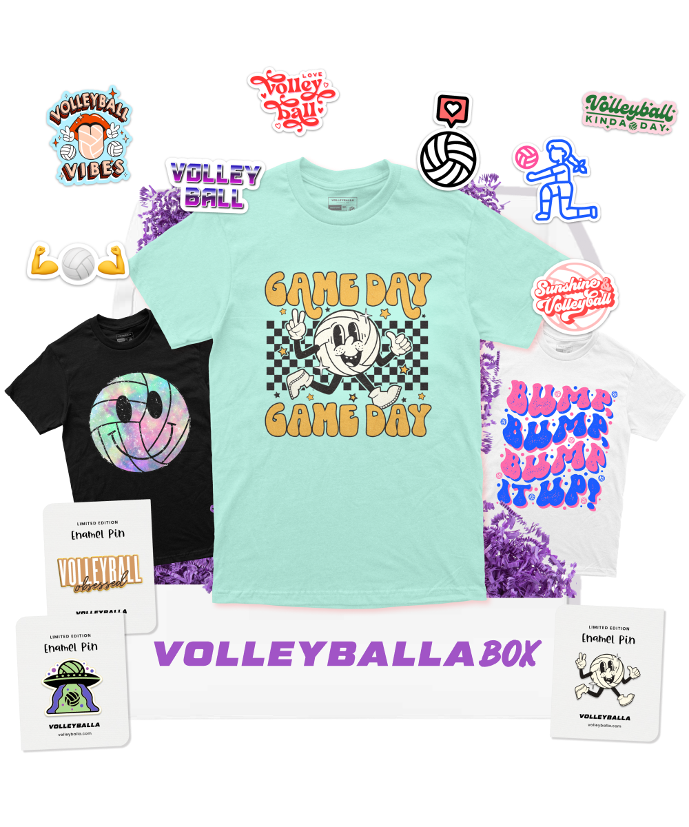 Volleyballa Box is a monthly volleyball t-shirt club delivered right to your door! Each box comes with 1 super soft t-shirt, limited edition enamel pin, two stickers, and an insert - all curated to a fun volleyball theme.